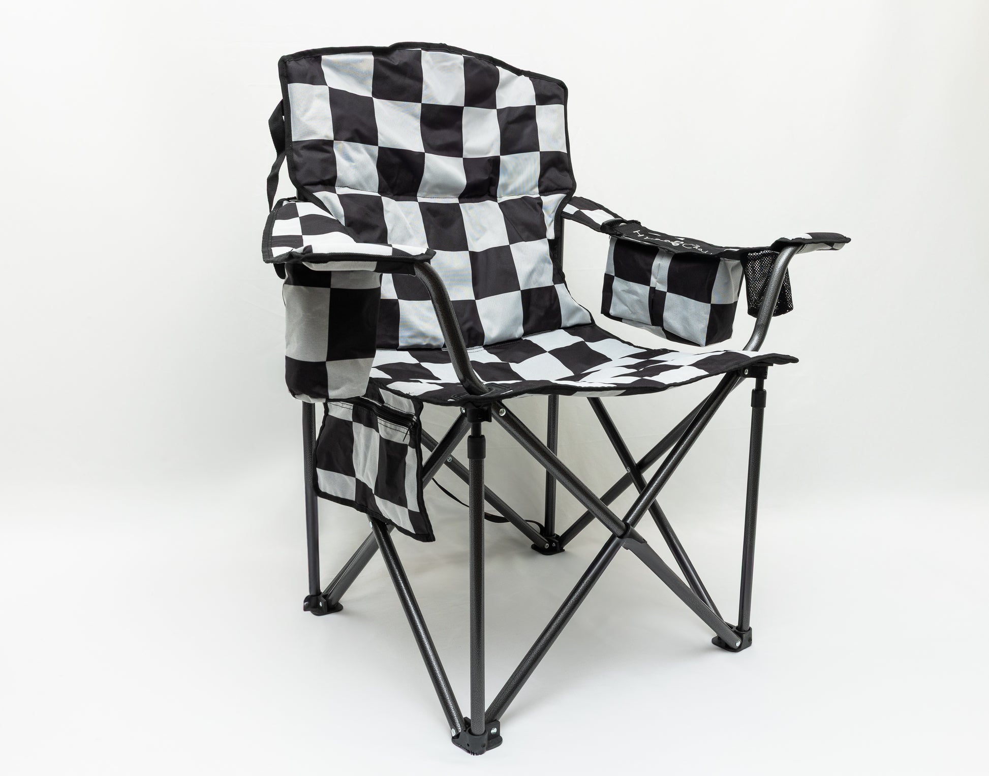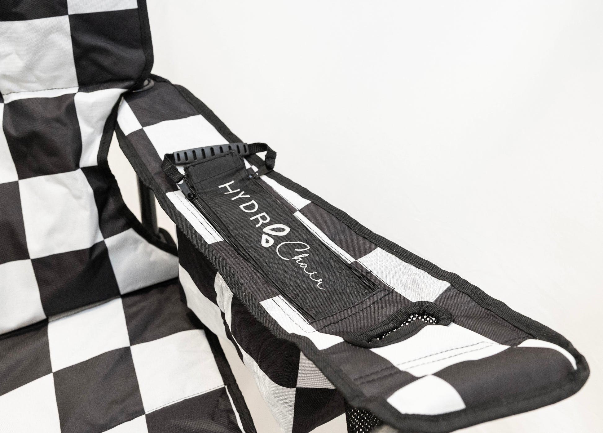The Hydrochair combines comfort, durability, and style in a bold checkered design that’s made to stand out. Designed with oversized cup holders that fit your favorite large tumblers — like Hydrojugs, Stanleys, or Hydroflasks — this chair makes staying hydrated easy wherever you go. A built-in cooler keeps your drinks chilled, while the zippered side pouch provides secure storage for your essentials. Whether you’re camping in the mountains, cheering from the sidelines, headed on a weekend getaway, or just relaxing in the backyard, the Hydrochair is your ultimate companion for laid-back lounging with a touch of luxury.